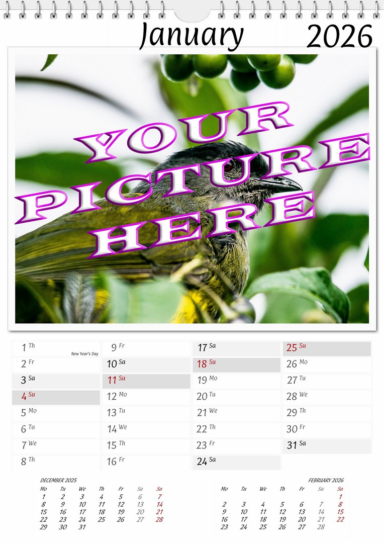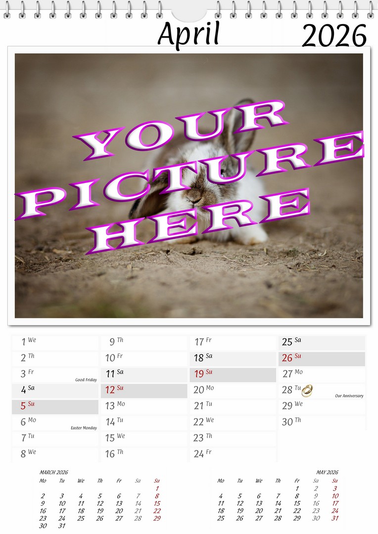 If you want to have a large, full page picture on the front page instead of the 12 small ones, please contact us via email: photocalendaruk@gmail.com