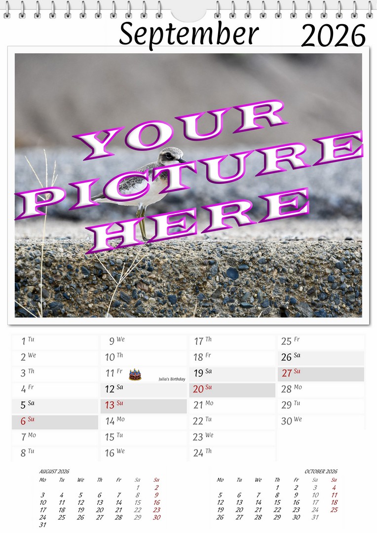 Large picture and space for your notes on the calendar below. Just under that you can find two thumbnails for the previous and the next month. You’ll need to upload during the checkout 12 good quality pictures, preferably in landscape format. Also during the checkout you can include your special dates in the note upload section.