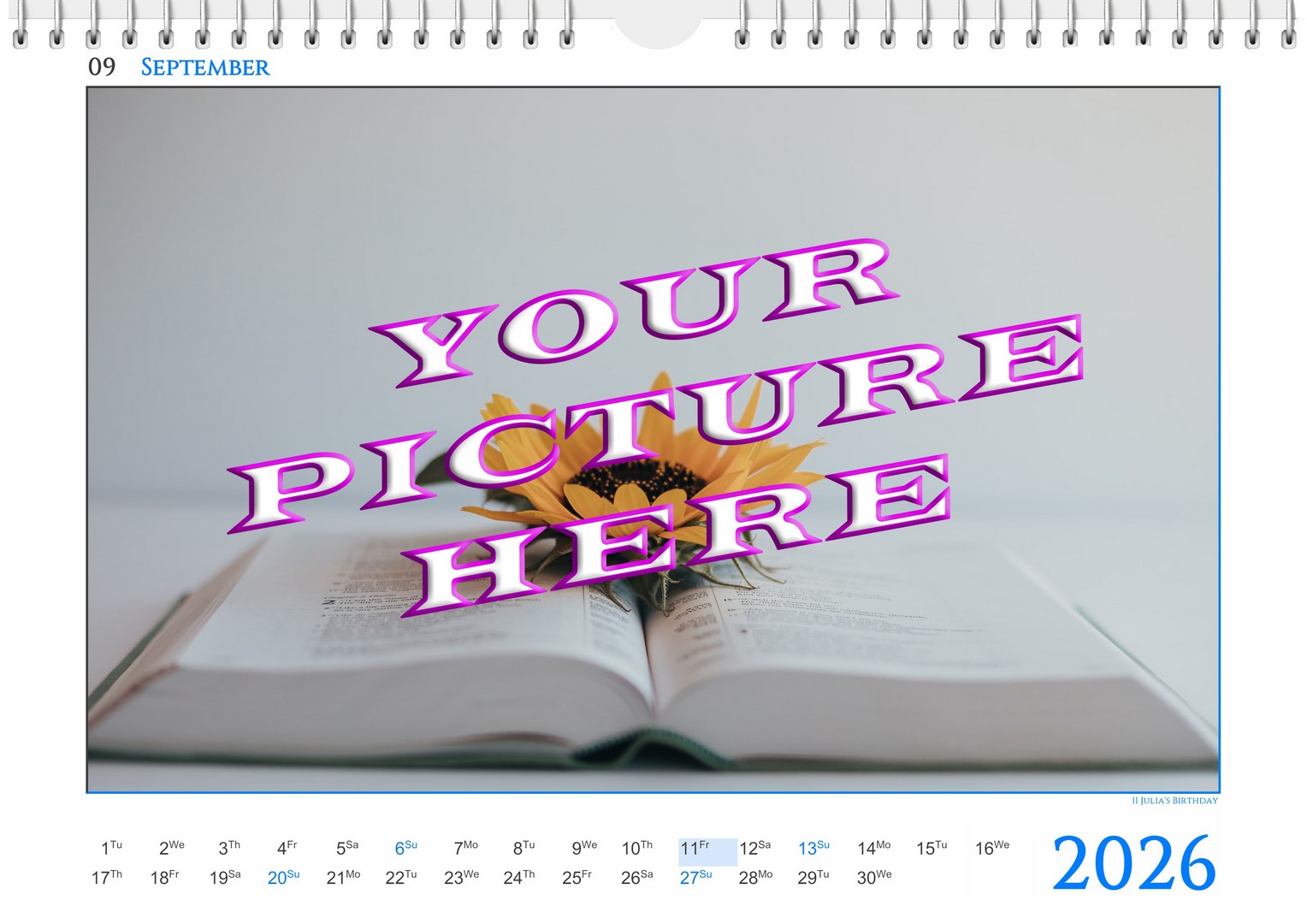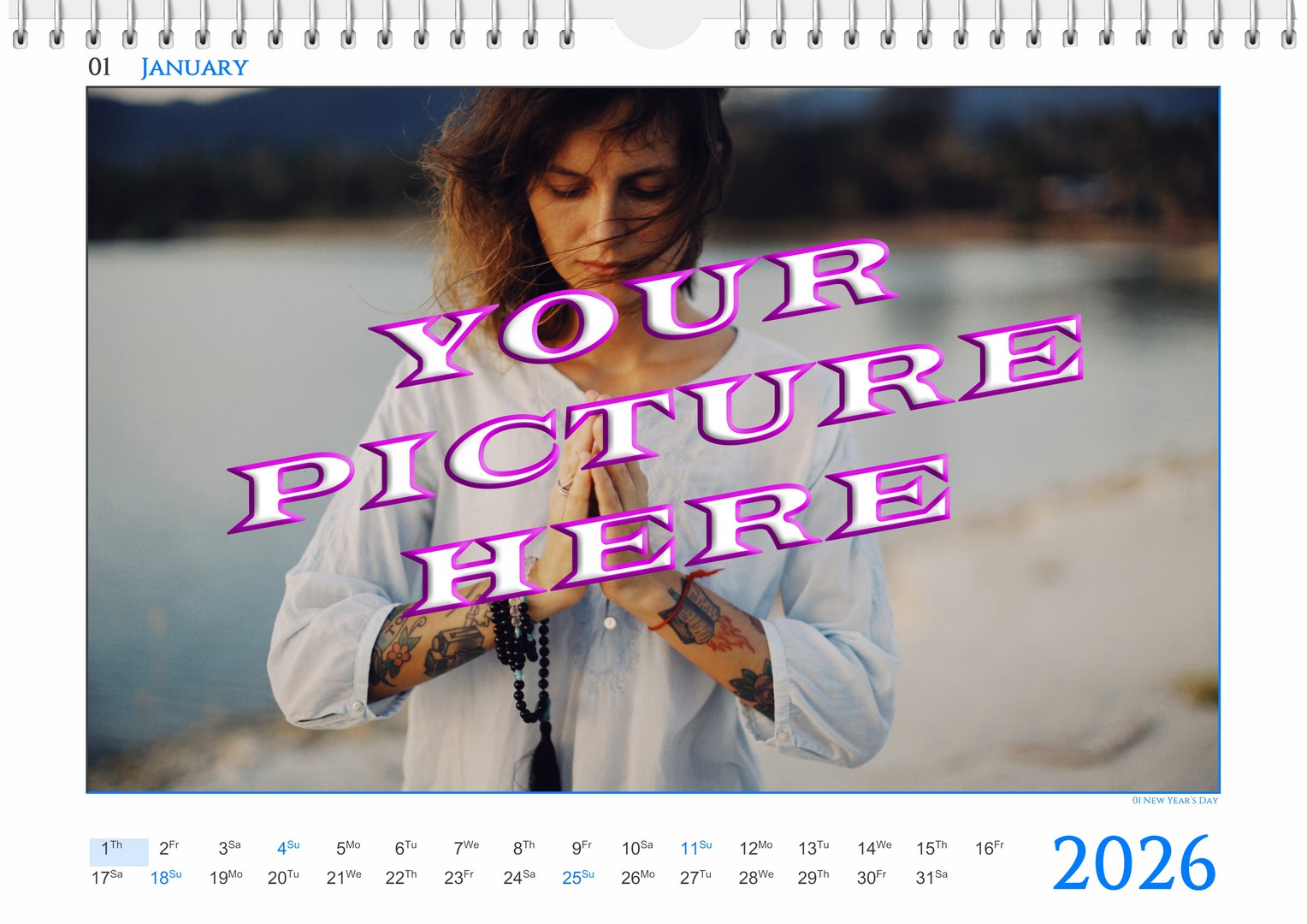 If you prefer the landscape orientation of your calendar, this one is for you. You’ll need to upload during the checkout 12 good quality pictures in landscape format. Also during the checkout you can include your special dates in the note upload section.