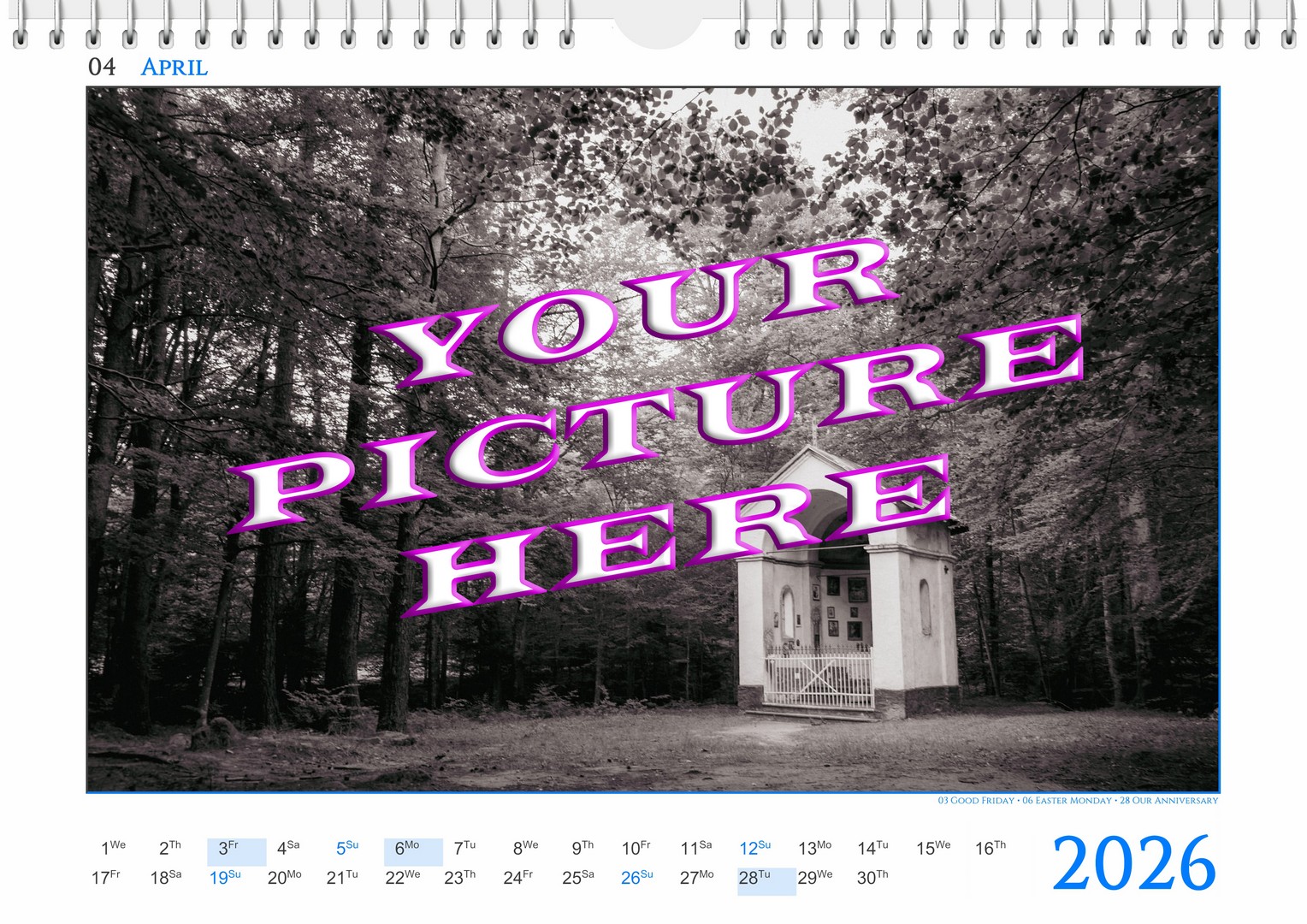 If you want to have a large, full page picture on the front page instead of the 12 small ones, please contact us via email: photocalendaruk@gmail.com